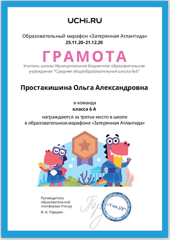 Результат участия: III место по школе (Обучающиеся 6 класс)