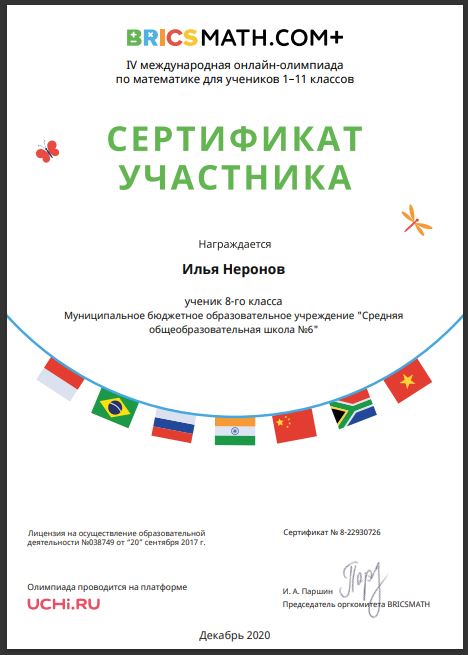 Результат участия: Неронов Илья , 8 класс, сертификат участника