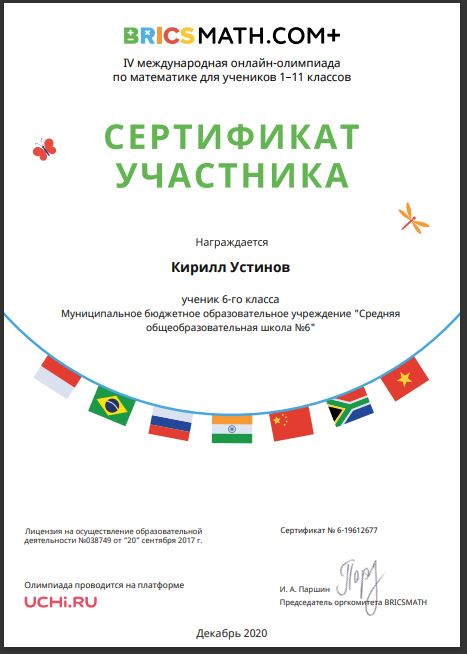 Результат участия: Устинов Кирилл , 6 класс, сертификат участника