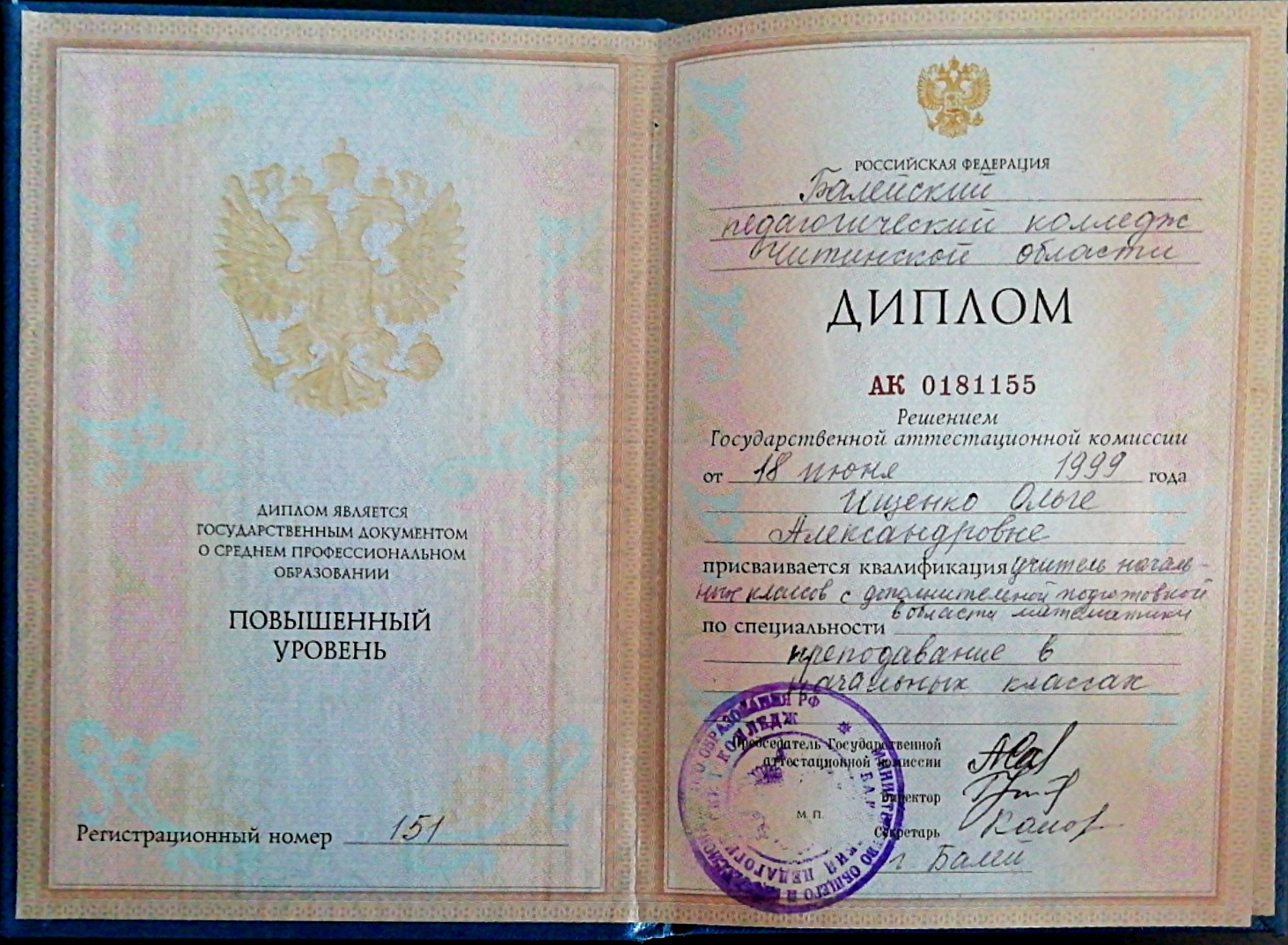 Квалификация: учитель начальных классов с дополнительной подготовкой в области математики